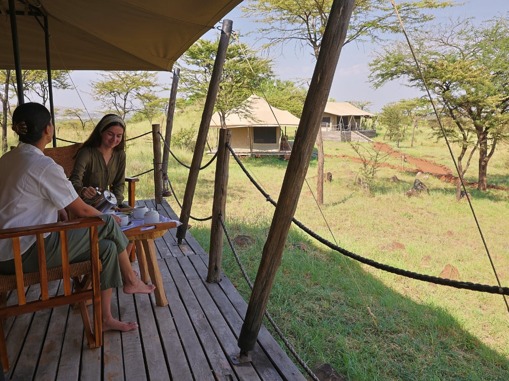 Spacious tents set on elevated platforms with ensuite bathrooms, 24ร—7 power, veranda and stunning Serengeti views.